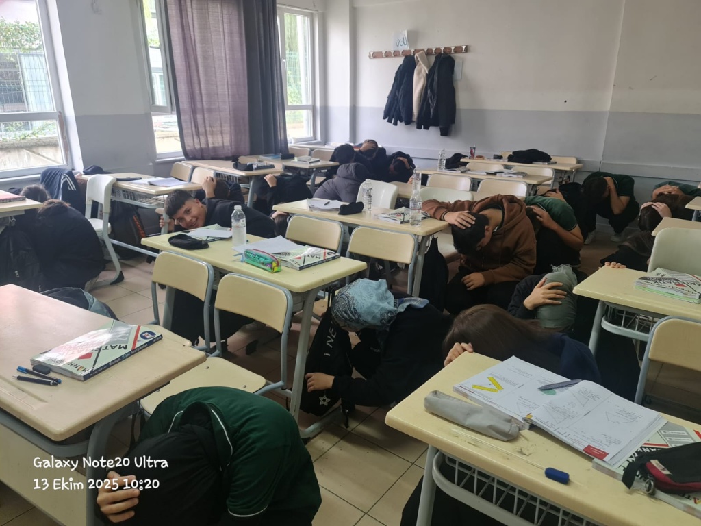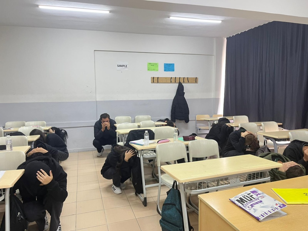 Ekim ayı "Afetler ve Dayanıklılık Ayı" etkinlikleri kapsamında okulumuzda, 13 Ekim Pazartesi günü saat 10.30'da "Deprem Anı ve Tahliye Tatbikatı" gerçekleştirildi. Deprem Haftası kapsamında yapılan deprem tatbikatına tüm öğretmen ve öğrenciler katıldı.